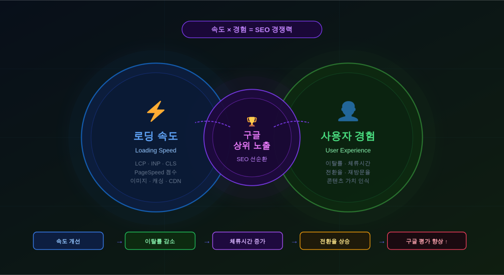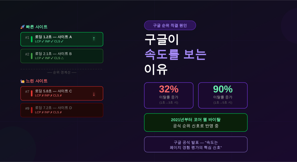 구글의 목적은 하나입니다. 사용자가 검색했을 때 가장 만족스러운 결과를 보여주는 것입니다. 아무리 좋은 정보가 담긴 페이지라도 열리는 데 5초가 걸린다면, 그 정보는 사용자에게 닿지 못합니다. 구글 입장에서는 좋은 콘텐츠라도 느린 사이트를 상위에 올려줄 이유가 없는 것입니다.