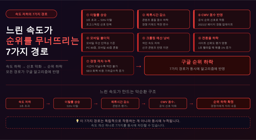 이제 핵심입니다. 속도가 느리면 정확히 어떤 경로로 구글 순위가 내려가는지, 7가지 이유를 하나씩 설명드리겠습니다.