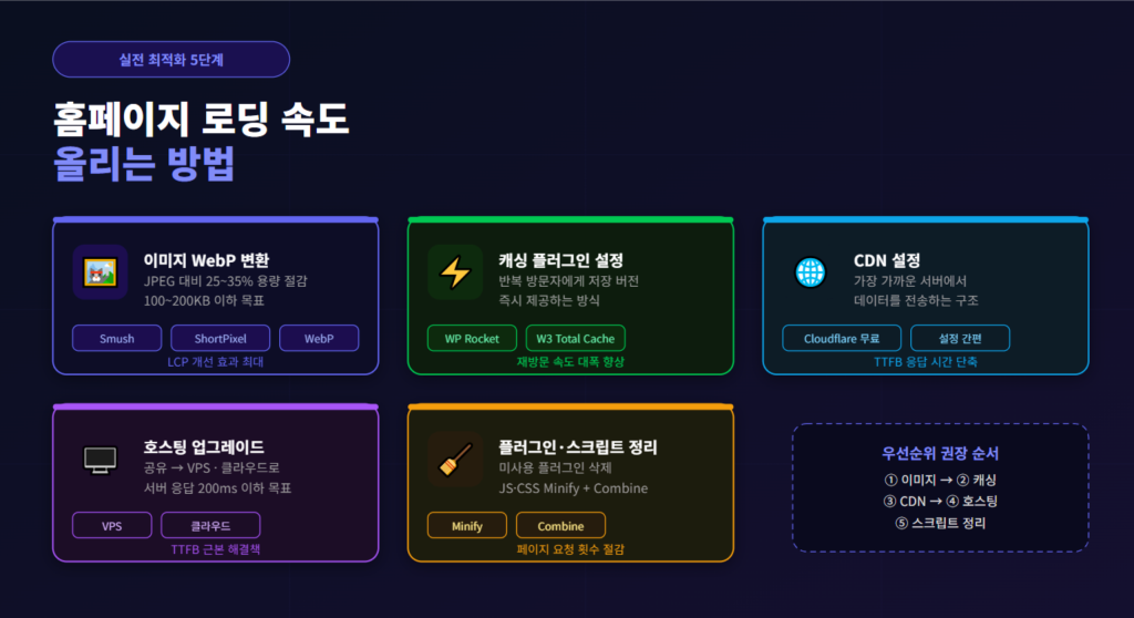 워드프레스는 W3 Total Cache나 WP Rocket으로 설정할 수 있습니다. WP Rocket은 유료지만 설정이 직관적이고 LCP 개선 효과가 확실해서 속도 최적화를 처음 시작하는 분들에게 가장 많이 권장하는 플러그인입니다.